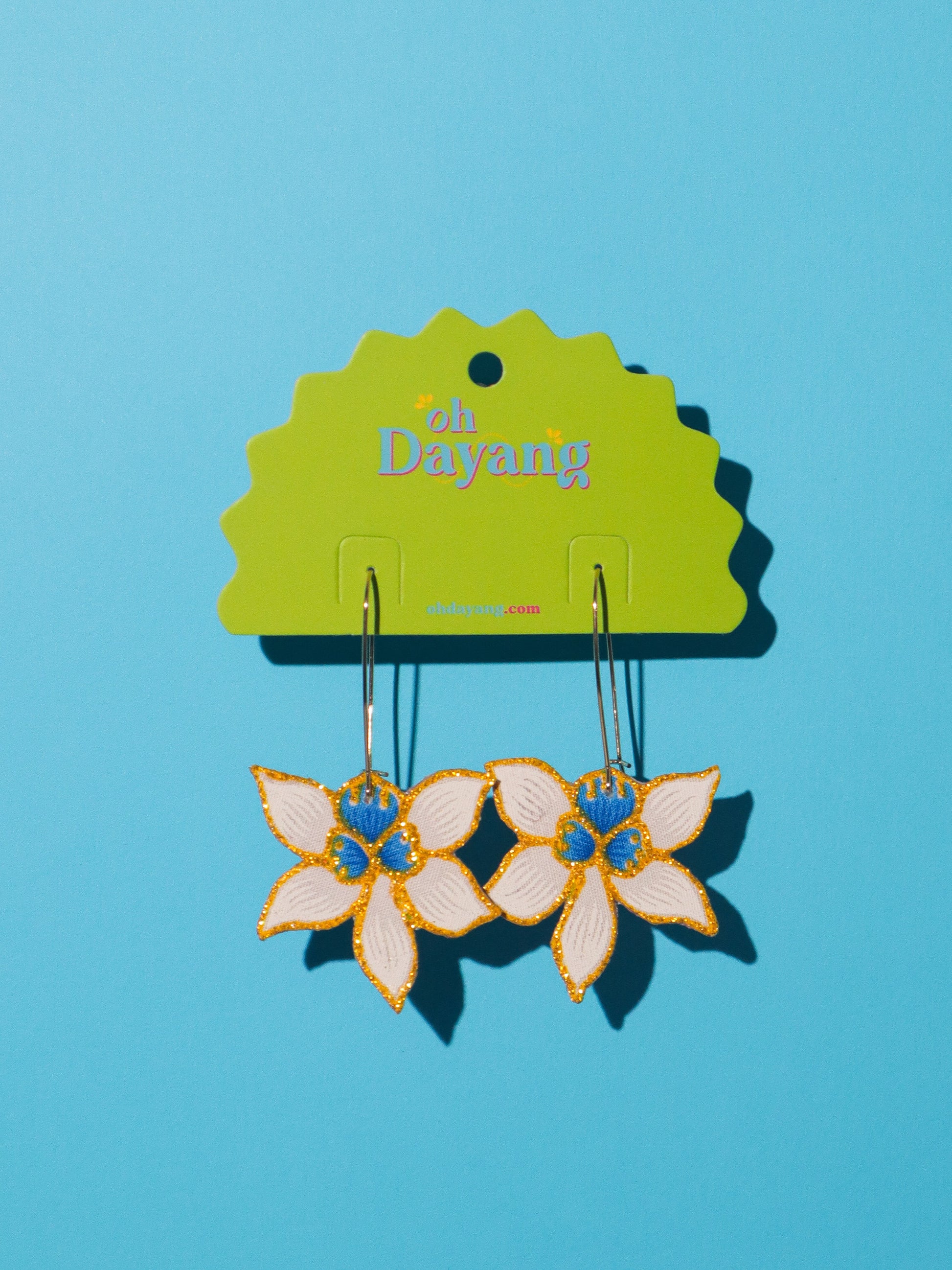 Add a pop of personality with these Bunga Batik Earrings. Handmade from batik cloths, each flower-shaped earring adds a unique touch to your outfit. Perfect for adding a fun and playful twist to any look. (Styling tip: pair with a simple outfit for a bold statement.)