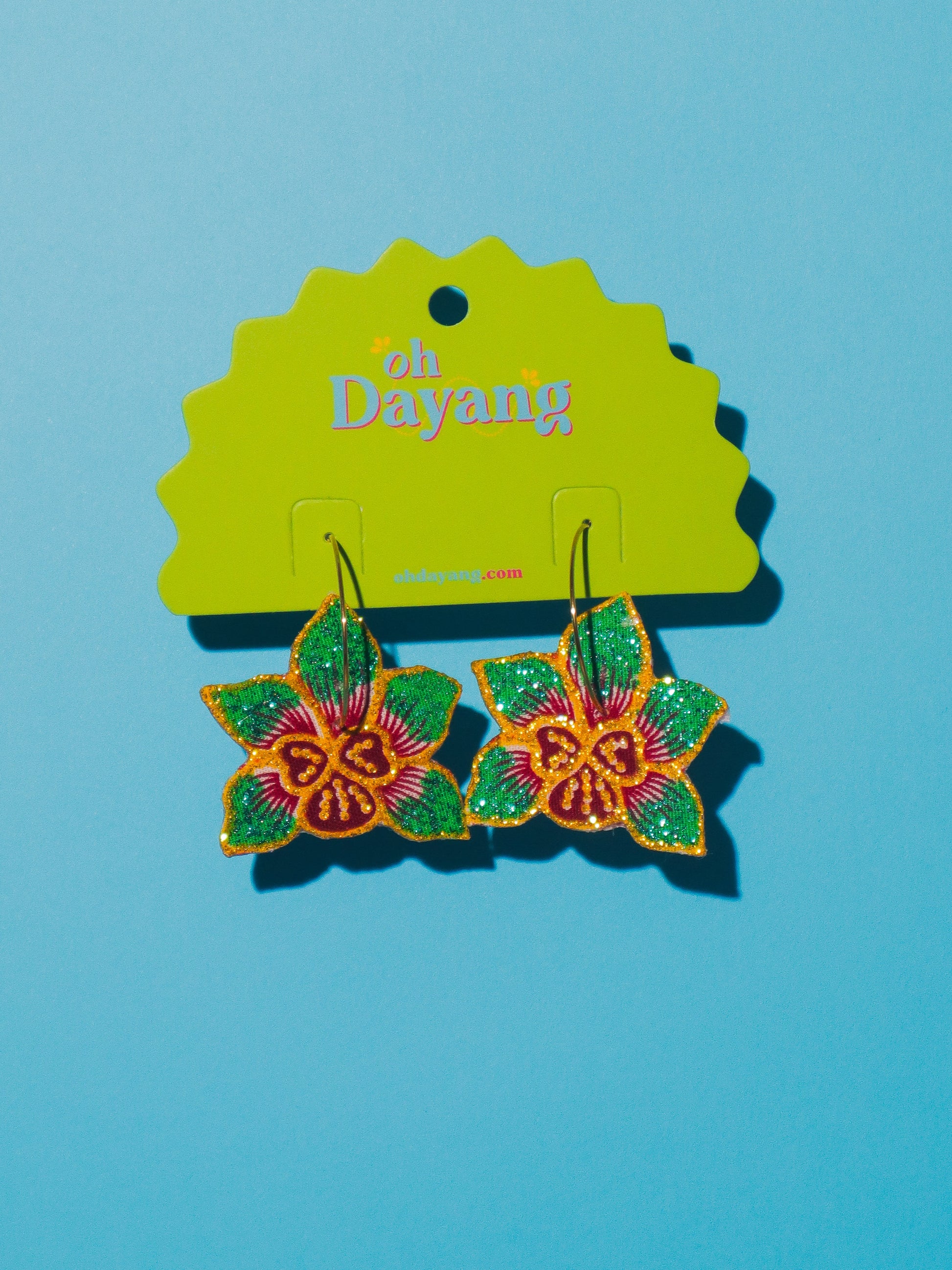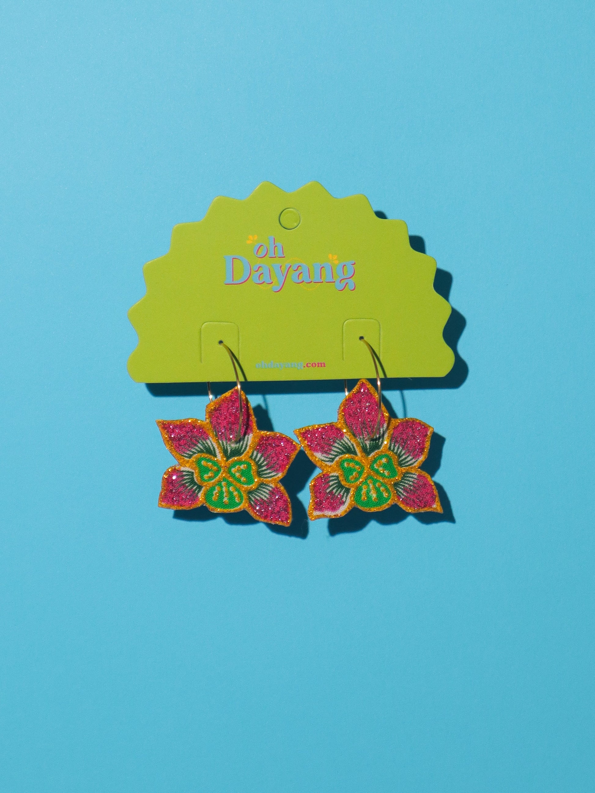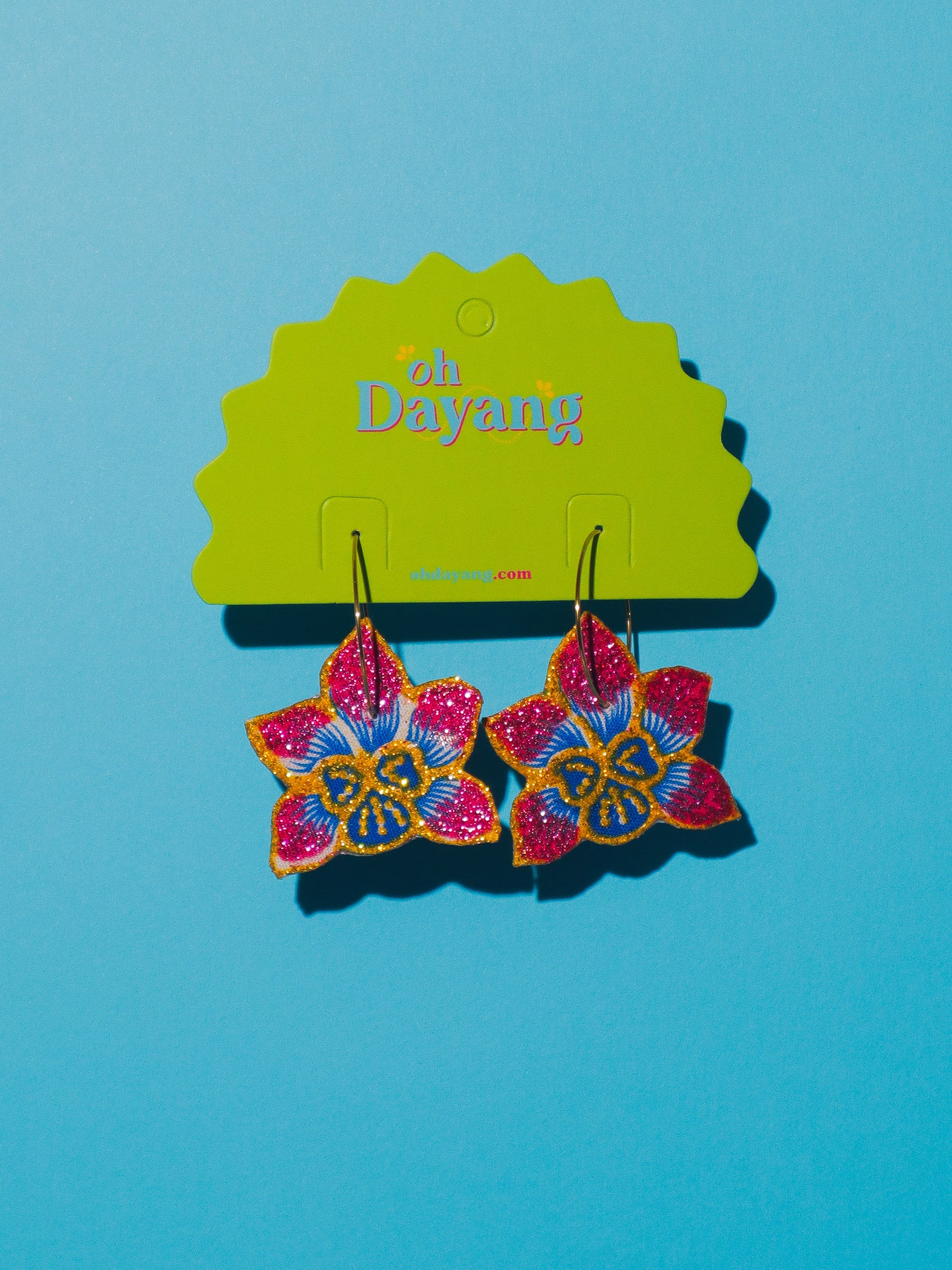 Add a pop of personality with these Bunga Batik Earrings. Handmade from batik cloths, each flower-shaped earring adds a unique touch to your outfit. Perfect for adding a fun and playful twist to any look. (Styling tip: pair with a simple outfit for a bold statement.)