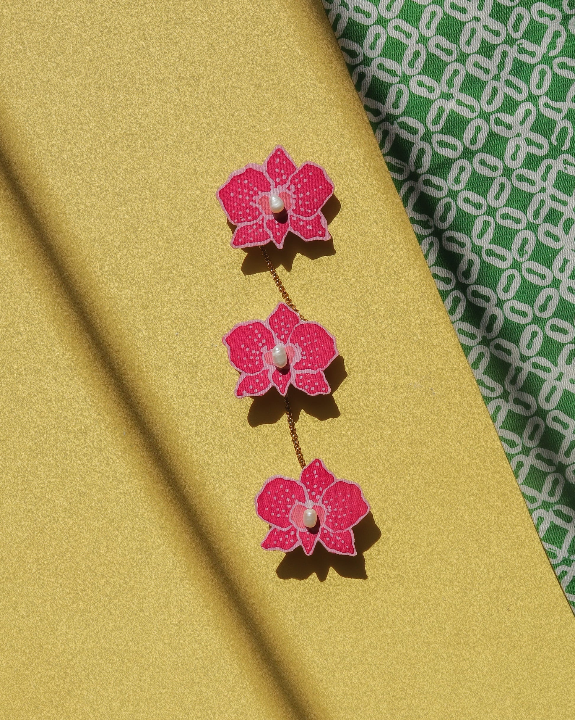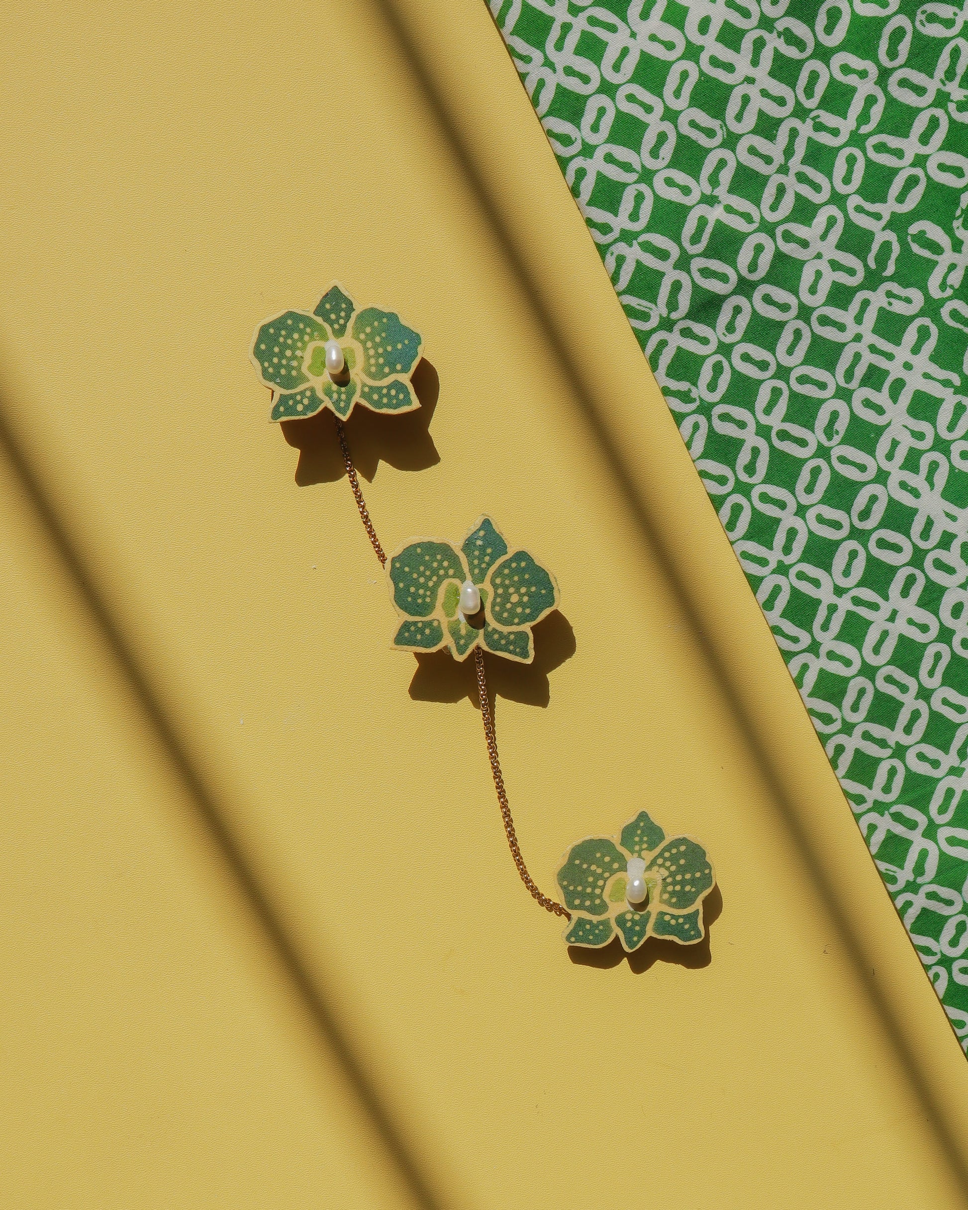 A delicate orchid motif, carefully handpainted on batik and paired with elegant pearl accents, now reimagined as a kerongsang chain. This piece blends traditional artistry with graceful movement, adding a soft statement to your kebaya or baju kurung.